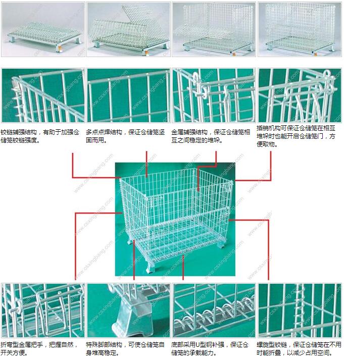 规格统一,容量固定,存放一目了然,使用强力钢条点焊而成,底部以U型槽焊接补强,使结构坚固,可互相堆叠四层高,配合叉车、台车、液压托盘车等设备,可使用于运输、搬运、装卸、存储等物流各个环节中